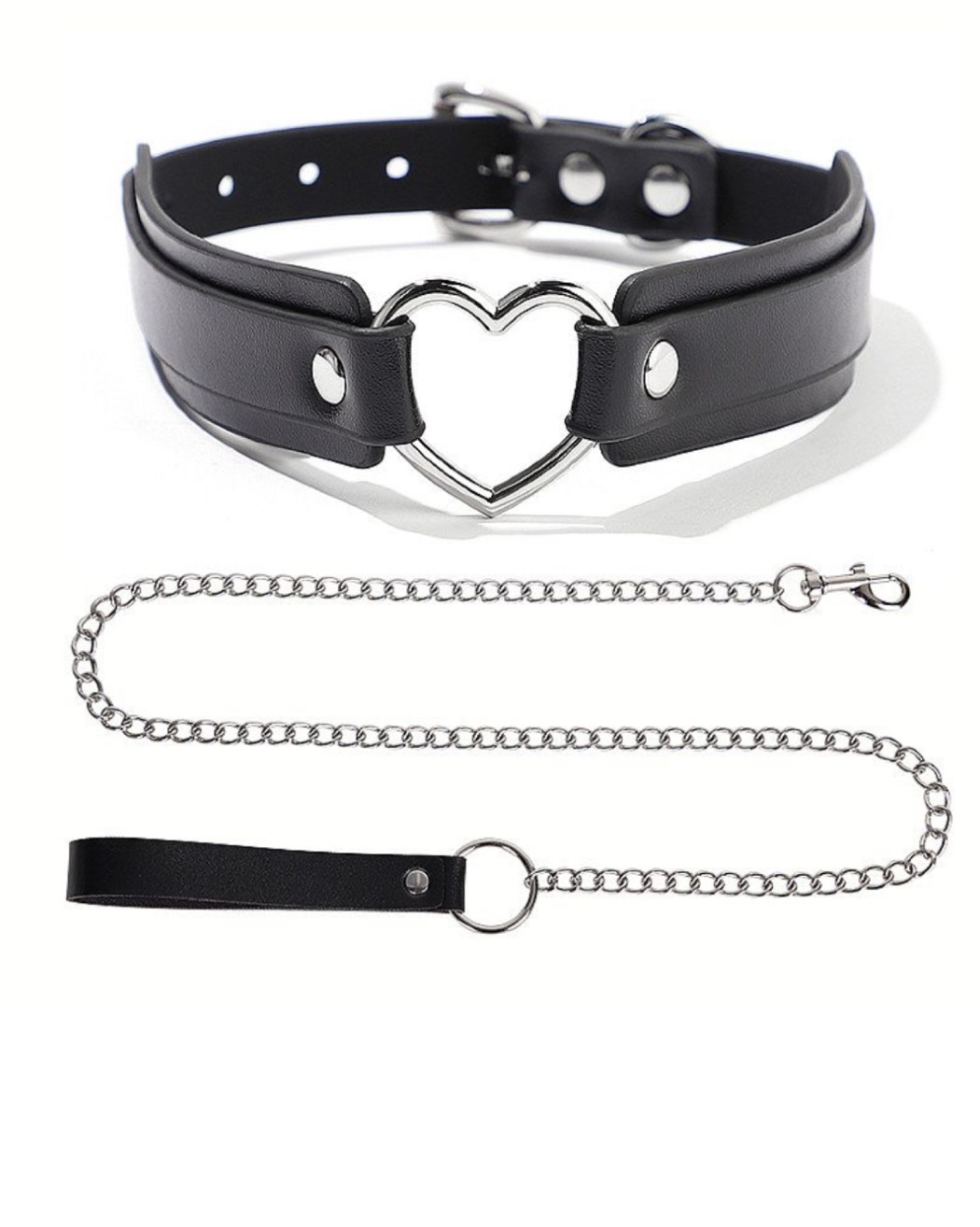 Coleira ajustável em couro sintético com guia de metal. É ideal para fantasias de submissão e entrega, é afivelada e possui guia para passeios e comandos. Traga seu amor na coleira.