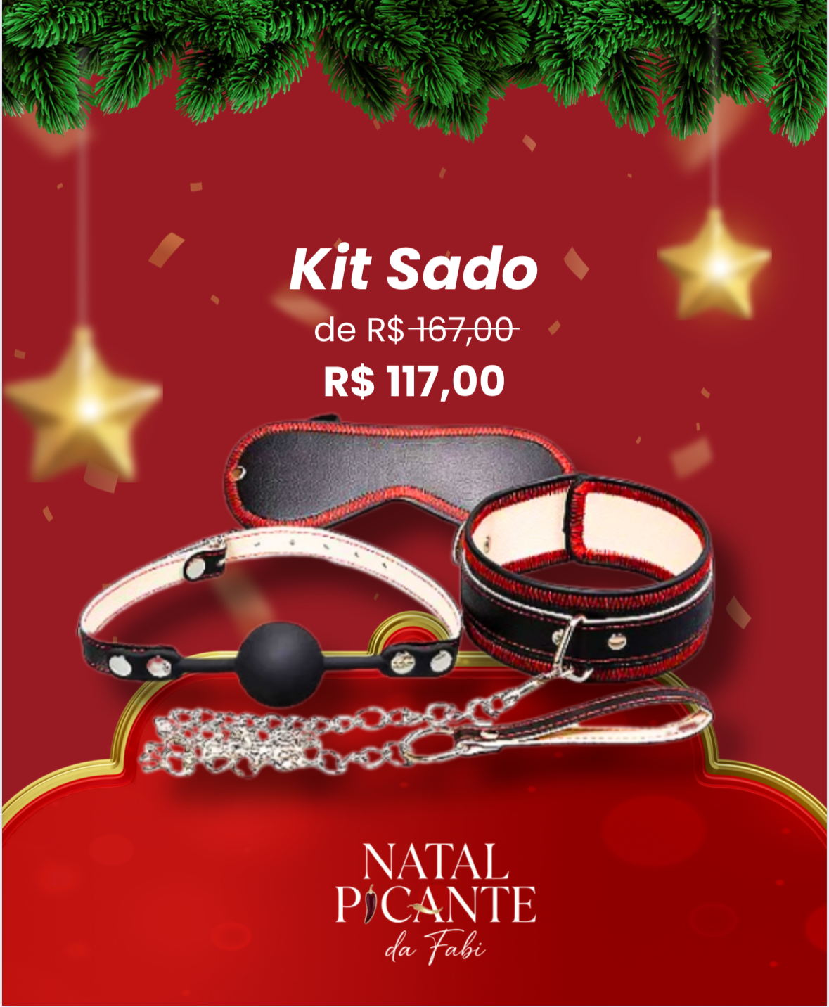 É um kit sado com 3 itens, sendo eles mordaça, venda e coleira com guia.